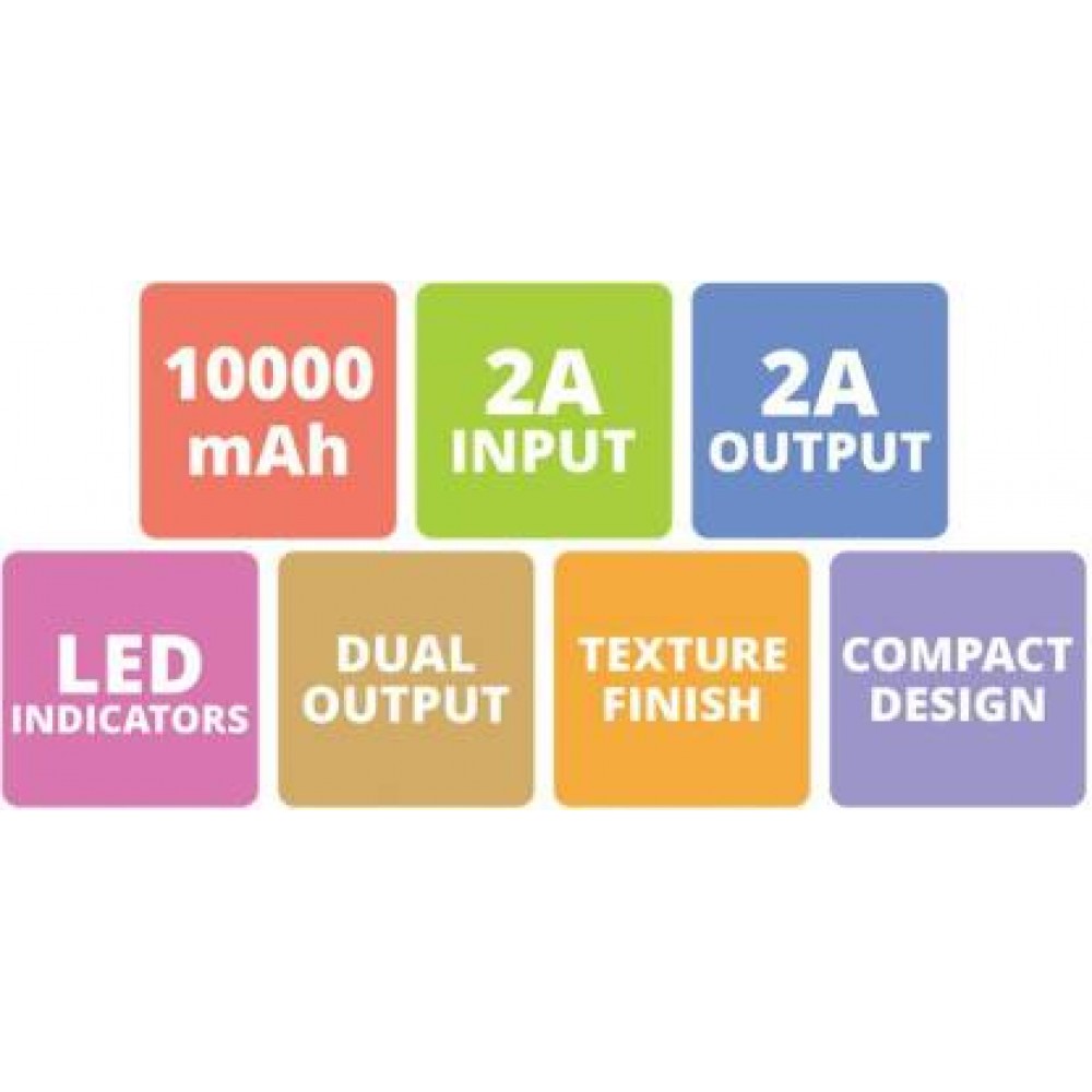 ZEB-PB10000 is a 10000 MAH power bank which comes in a textured finish with a compact design . It has a 2 USB output and an LED indicator for battery usage.