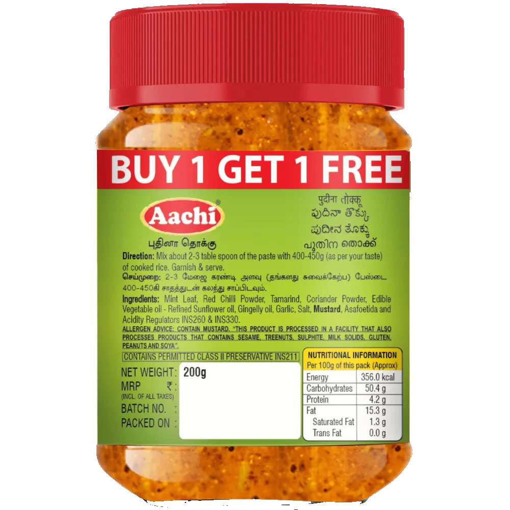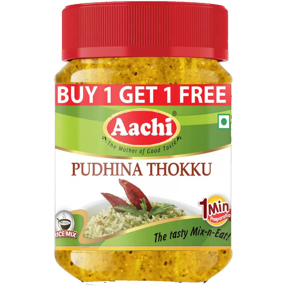 Mix 3-4 tbsp of Aachi Pudhina Thokku to 400-450g of cooked rice. Garnish with coriander leaves and serve. It may also be used as a side dish for Idly, Dosa, Chappathi and poori.