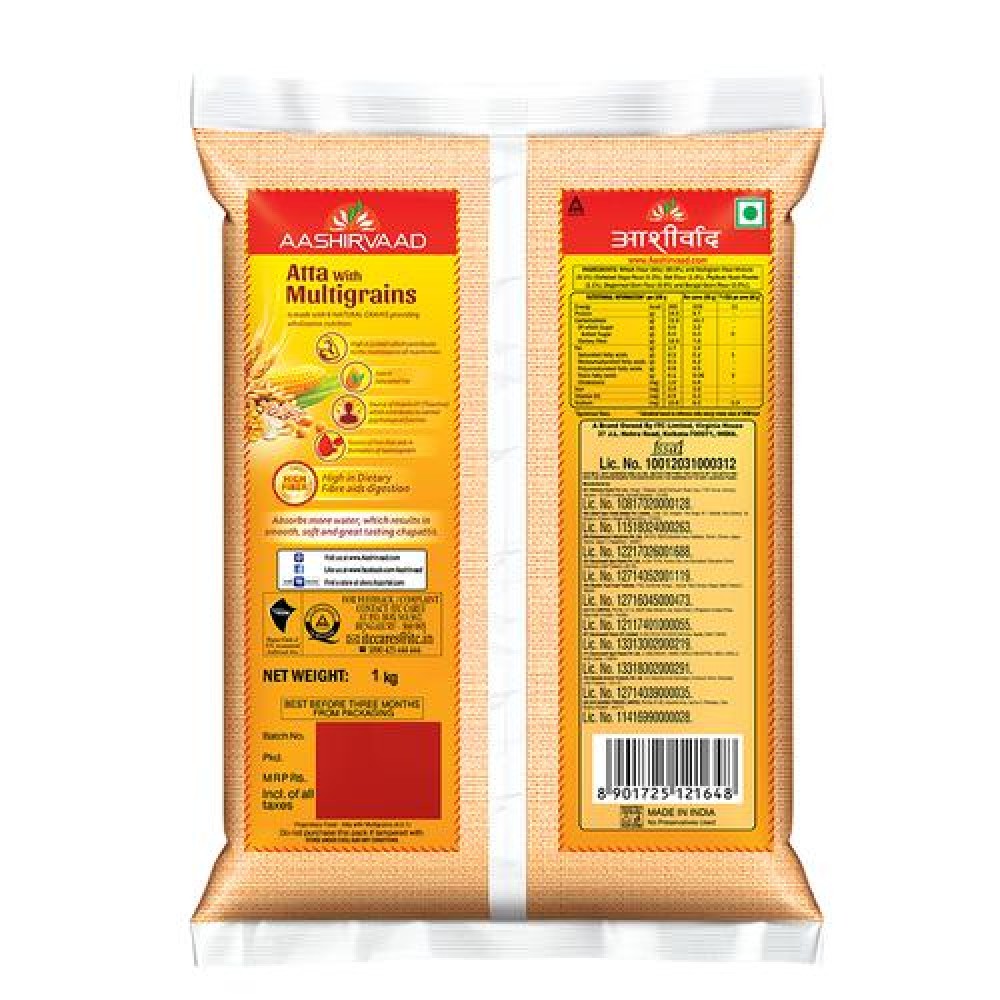 AASHIRVAAD Atta with Multigrains gives you the wholesome goodness of six different grains: wheat, soya, channa, oat, maize and psyllium husk. These ingredients infuse proteins, vitamins, minerals and fibre into your diet. So you and your family stay active, healthy and energetic, everyday.
