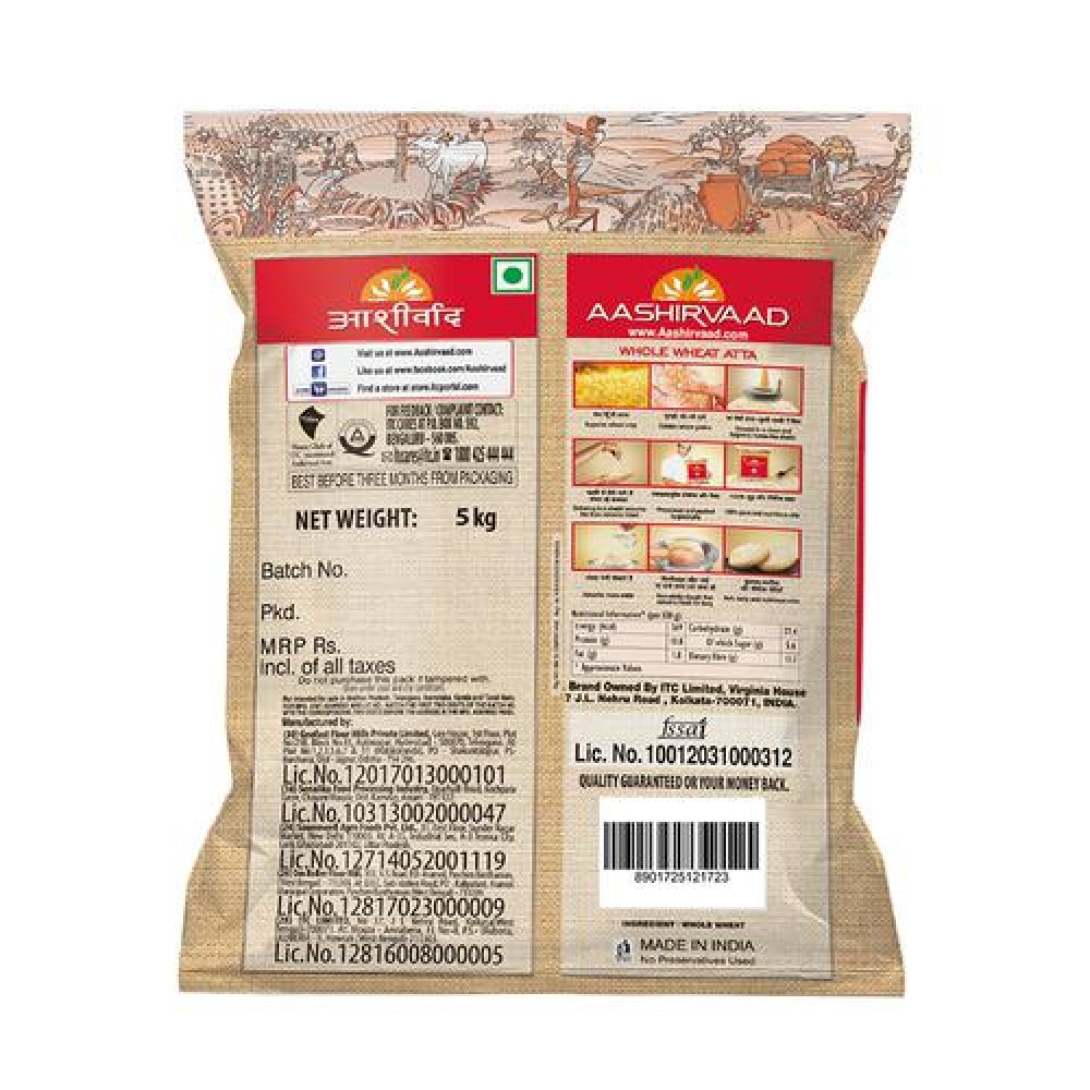 AASHIRVAAD Whole Wheat Atta is made from the grains which are heavy on the palm, golden amber in colour and hard in bite. It is carefully ground using modern 'chakki - grinding' process which ensures that AASHIRVAAD Atta contains 0% Maida and is 100% Sampoorna Atta. Thus we ensure you get superior chakki atta, through our 4 Step Advantage process of sourcing, cleaning, grinding and nutrition lockage.