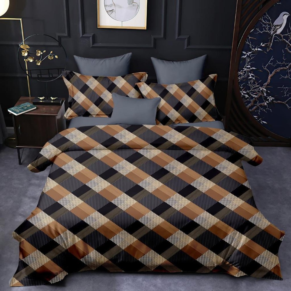 Bed and 2 Pillow Covers in 90x95 inch size, Glaze Cotton material and orange and brown checks colour design.