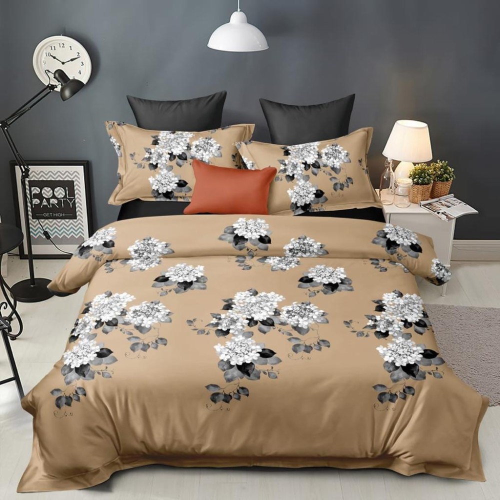 Bed and 2 Pillow Covers in 90x95 inch size, Glaze Cotton material and white flowers creamy brown colour design.
