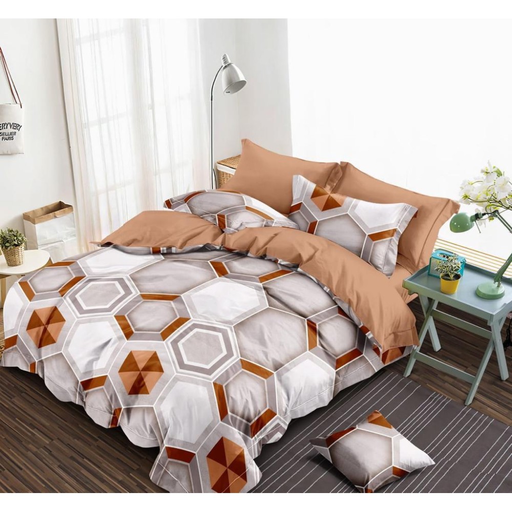 90x95 இன்ச் அளவில் படுக்கை மற்றும் 2 தலையணை கவர்கள், கிளேஸ் காட்டன் மெட்டீரியல், வெள்ளை ஆரஞ்சு பென்டகன் வடிவமைப்பு நிறம்.