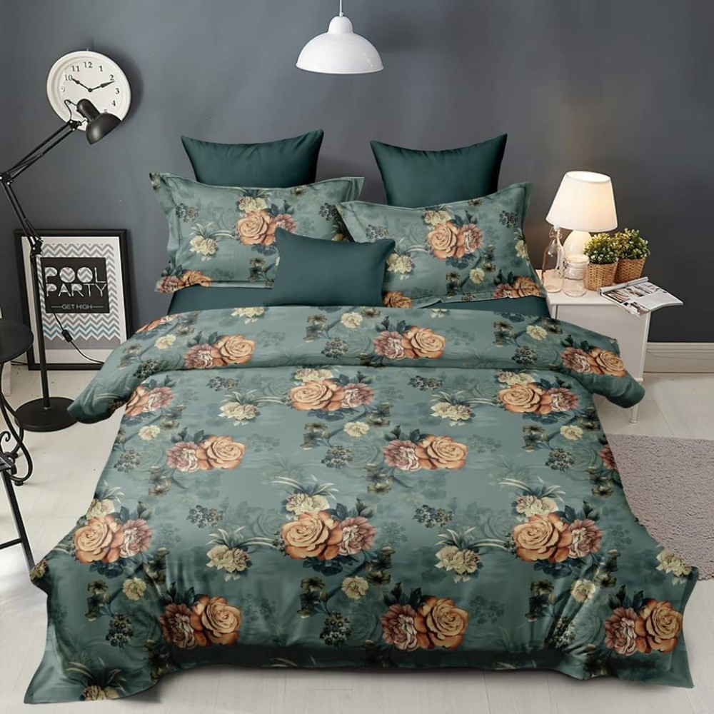 90x95 இன்ச் அளவில் படுக்கை மற்றும் 2 தலையணை கவர்கள், கிளேஸ் காட்டன் மெட்டீரியல், மஞ்சள் நிற மலர்கள் நிறைந்த பச்சை நிறம்.