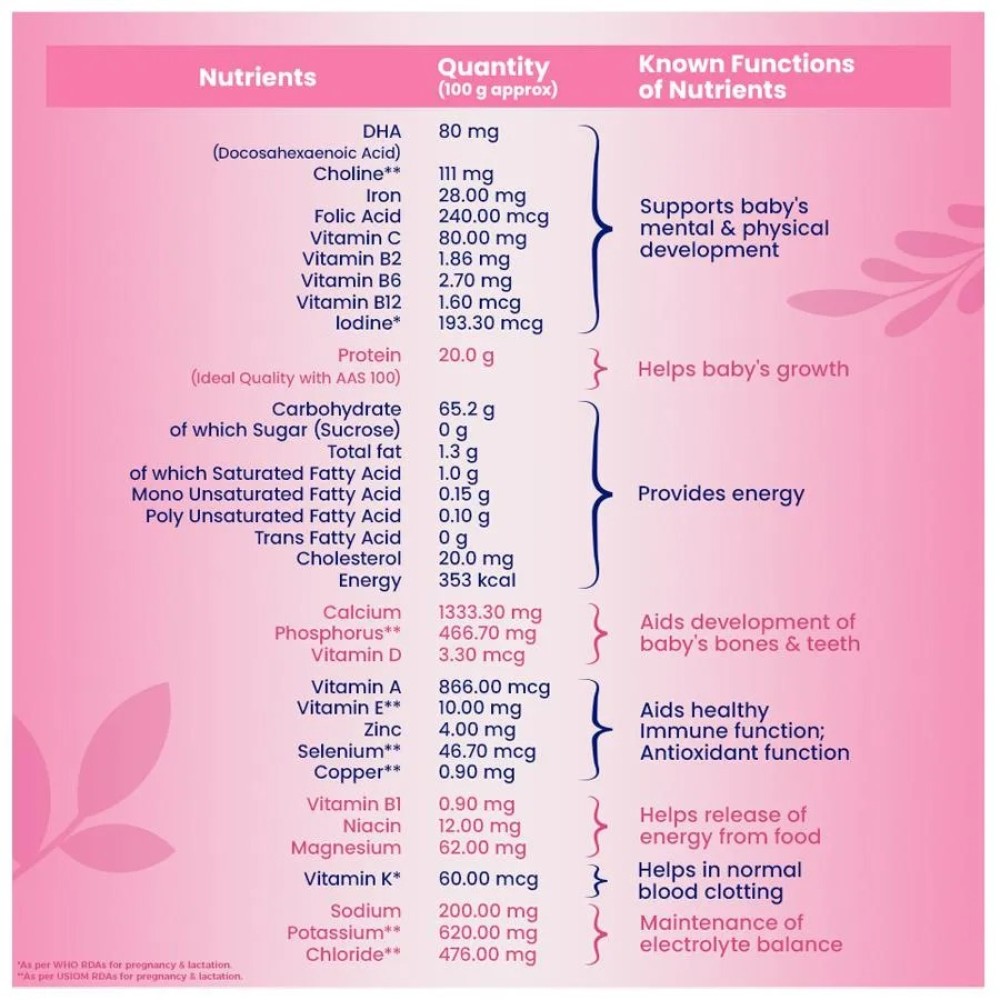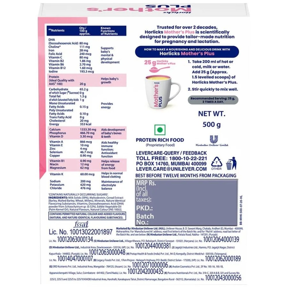 Specialized nutrition for pregnant and breastfeeding women. Mother's Horlicks Contains nutrients important for healthy pregnancy and lactation. It contains nutrients that are known to help improve birth weight. It contains DHA and choline that are important for brain development.
