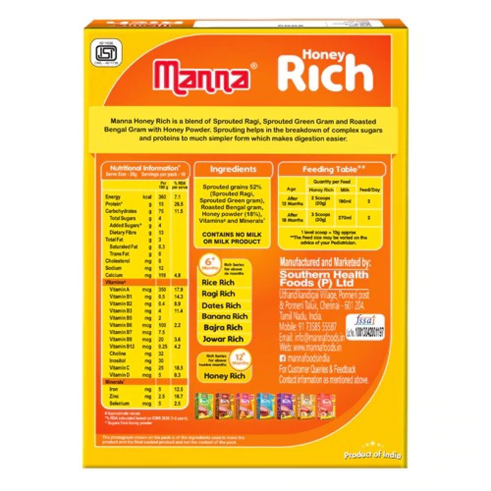 Manna Honey Rich is made up of sprouted Ragi, sprouted green gram, roasted bengal gram with honey powder.