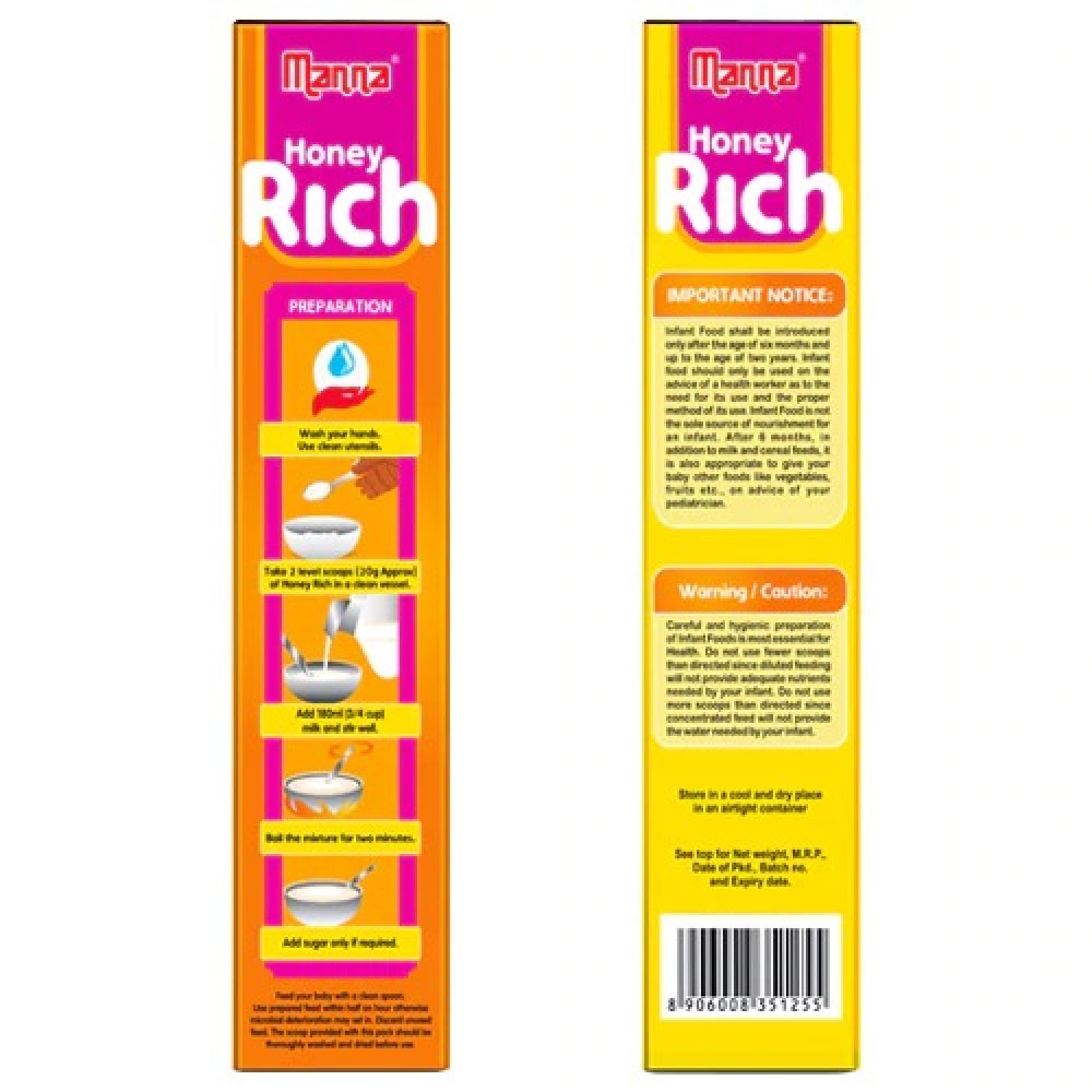 Manna Honey Rich is thus an ideal ‘First Solid Food’ for babies. It is suitable for ages 12-24 months