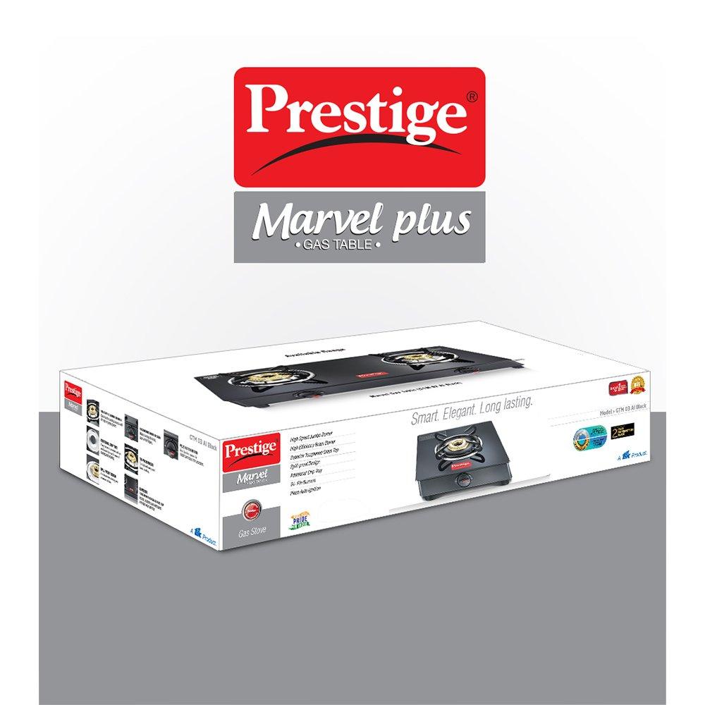 Prestige Marvel Plus Gas Stove with Stainless Steel Body. A Smart and Compact Glass top Gas table for a modern kitchen!The specialty of this Glass Top Gas Stove from Prestige is that it is compact in size and thoughtfully designed to consume less countertop space. These gas tables come with shatter proof toughened glass top for longer life and convenient cleaning. It has highly efficient tri pin burners, which helps you to cook faster and more efficiently. It comes with an extra drip tray for ease of cleaning. These gas tables are a combination of performance, efficiency and good looks and a great value for money product.