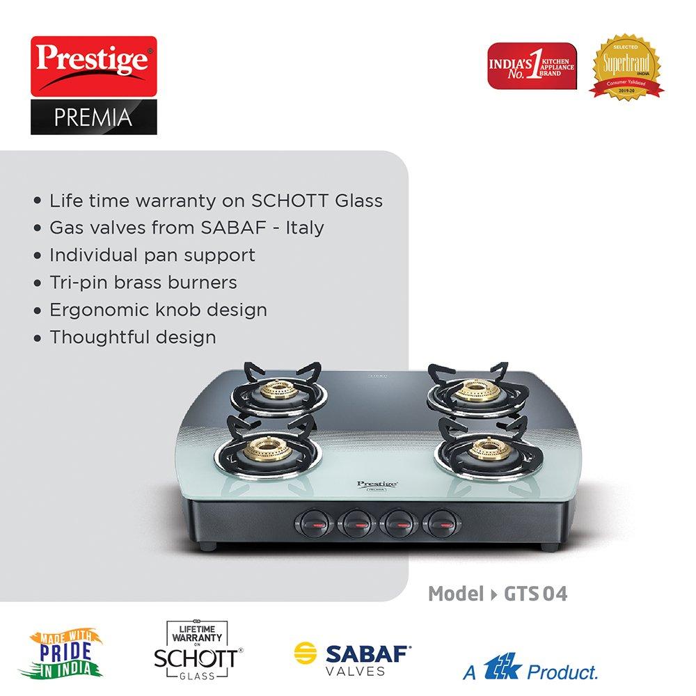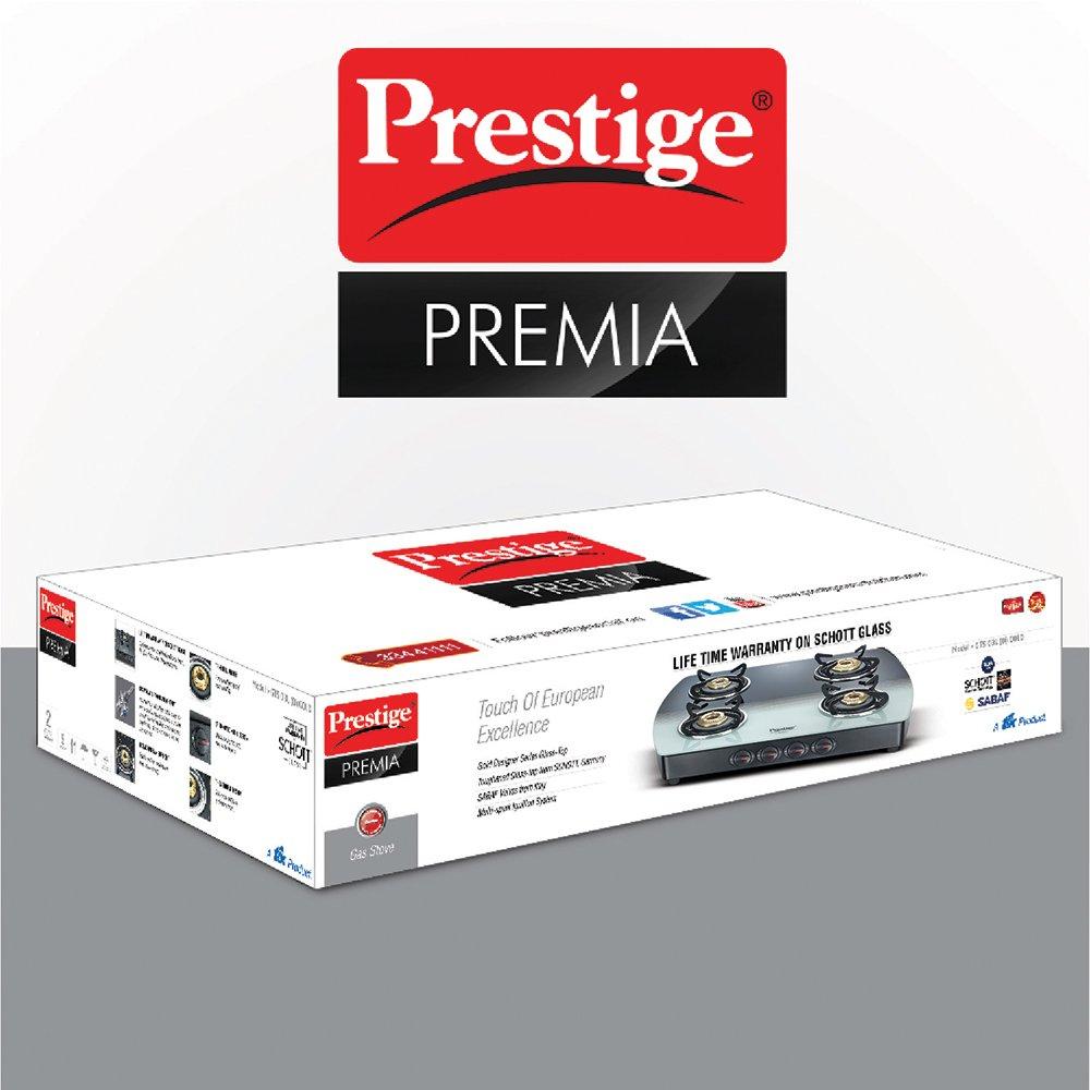 Prestige Premia Designer Glass Top Gas Table, Black & White Series. Now get a Designer Glass Top Gas Table with a touch of German Excellence! The new range of Prestige PREMIA Glass Top Gas Tables come with the expertise of SCHOTT with German manufacturing standards to ensure you get finest quality glass. The SCHOTT glass is tested to withstand higher thermal shock and mechanical impact than any other glass. The Designer looks of the Glass makes it a class apart and add elegance to your beautiful Kitchen.The curved body and contemporary design will make this Cook Top the biggest attraction of your Kitchen!