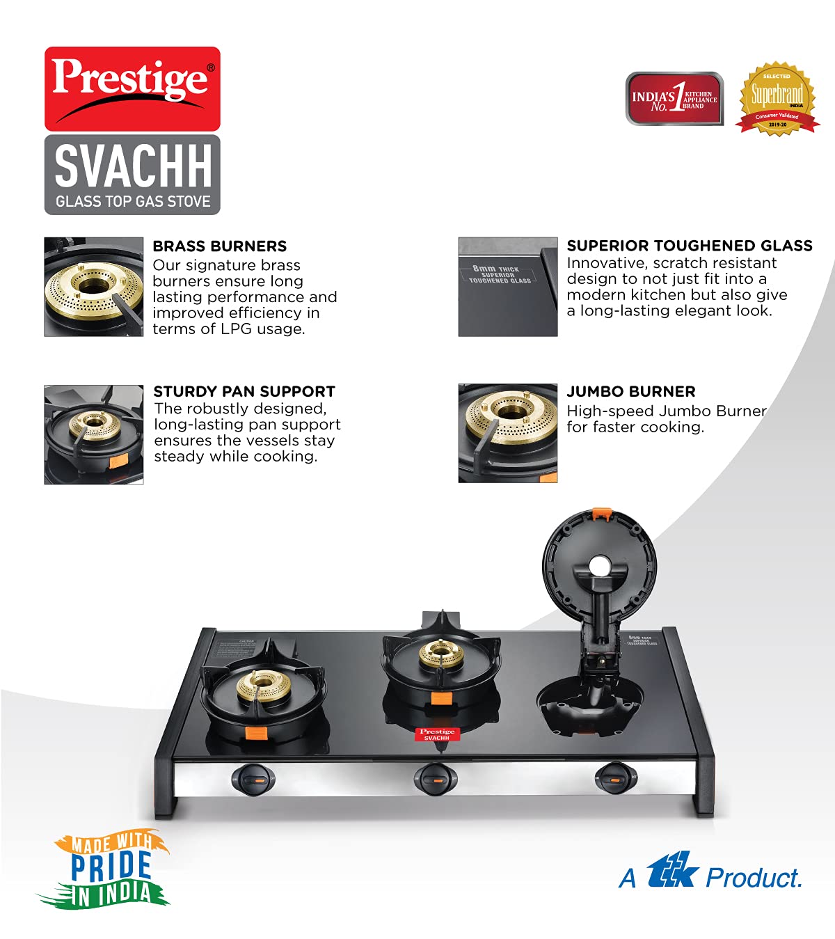 | Included Components | Prestige Svachh GTSV-02 Glass Top Gas Stove, With Liftable Burner Set, 3 "Burner" |