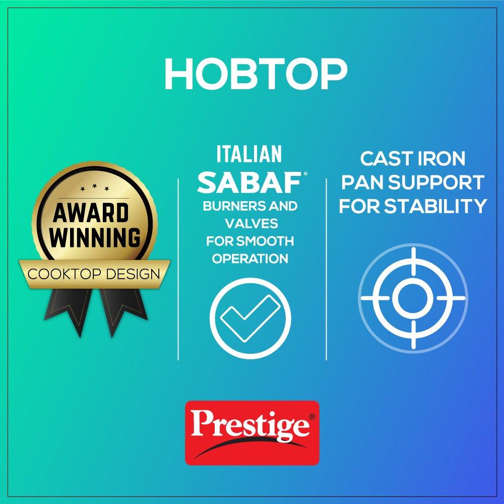 PRESTIGE HOBTOP-INDIA’S FIRST CONVERTIBLE GAS STOVE with Lifetime Warranty on SCHOTT Glass.. Designed to be the world's slimmest cook-top, the Prestige Hob-top is both a gas stove and a hob. The German technology SCHOTT glass top with Two color tone is not only elegant to look at but also easy to clean.With knobs conveniently placed on the top, the Hob-top comes with advanced auto ignition feature which makes it convenient for cooking . And to top it all , the Hob-top has burners and other components from Sabaf , which is one of Italy's leading brands for gas top and hob components . These Sabaf burners provide uniform heating , consume lesser gas and are specially crafted for Indian cooking . What's more, the Hob-top meets the highest European emission norms. This high technology and long lasting product comes to you with trust from brand Prestige- India’s No.1 kitchen appliance brand. It is the perfect Cook Top to make your Modular Kitchen Graceful and Stylish!