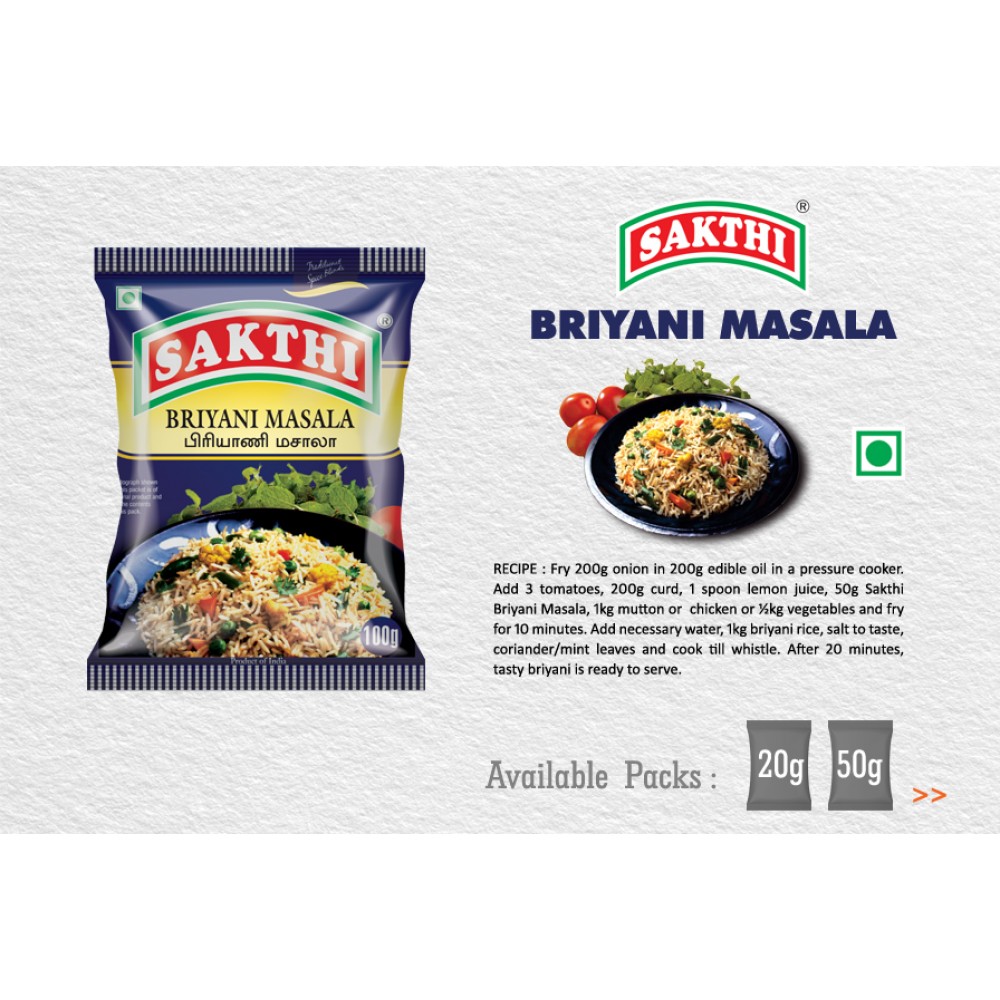 Specifications: Sakthi Biriyani Masala powder is made from the purest of spices of our country. It is a delicate blends of numerous spices, just a rush of it a dish of vegetables and meat, poultry or fish is enough to convert it into a gourmet's delight.