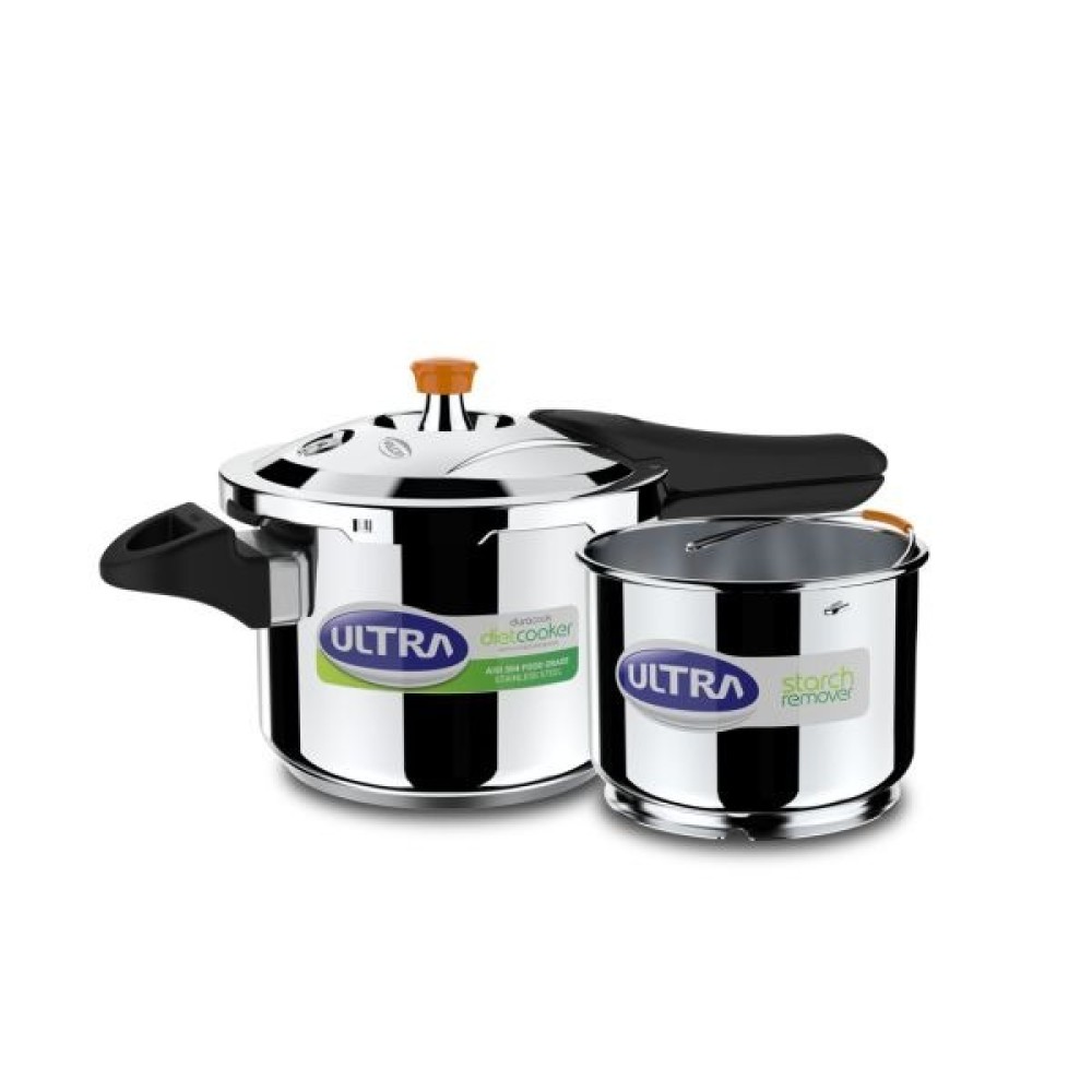 The 3L Ultra Diet cooker is a first in the market, pioneering the adoption of healthy, conventional cooking in modern technology. It comes with a starch remover that removes the liquid starch from rice after cooking, which in effect emulates the traditional starch water draining practice done during boil-cooking of rice. It has a high-impact bonded 3 layer composite base for fast and uniform cooking, a rust resistant AISI 304 food grade stainless steel body and bakelite handles with twin screws, ensuring that a healthy meal is also prepared in a durable utensil.