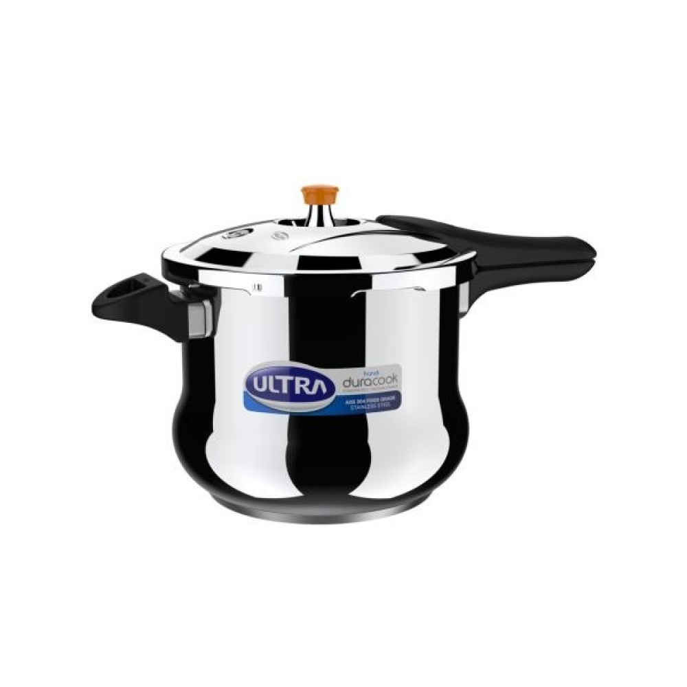 The 8L Ultra duracook pressure cooker is made of AISI 304 food grade stainless steel and hence ensures rust free healthy food. The high-impact bonded 3 layer composite base enables even distribution of heat through the bottom and aids uniform cooking without any burning or charring. The cooking time is also much less than in other regular cookers. The heat-resistant & heavy solid bakelite handles with twin screws ensures that handles do not become loose. Healthy and fast cooking, durability are good reasons to upgrade to an Ultra duracook stainless steel pressure cooker.