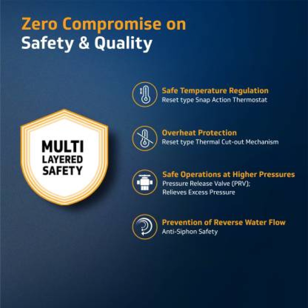 ASSURANCE OF SAFETY: V-Guard’s Zio Instant water heater's safety features include a thermostat and thermal cut-off that shield the device from damage caused by overheating. The pressure release and anti-siphon valves protect against excessive pressure build-up and reverse water flow, respectively. Multilayer corrosion and scaling protection ensure clean, non-pungent water.