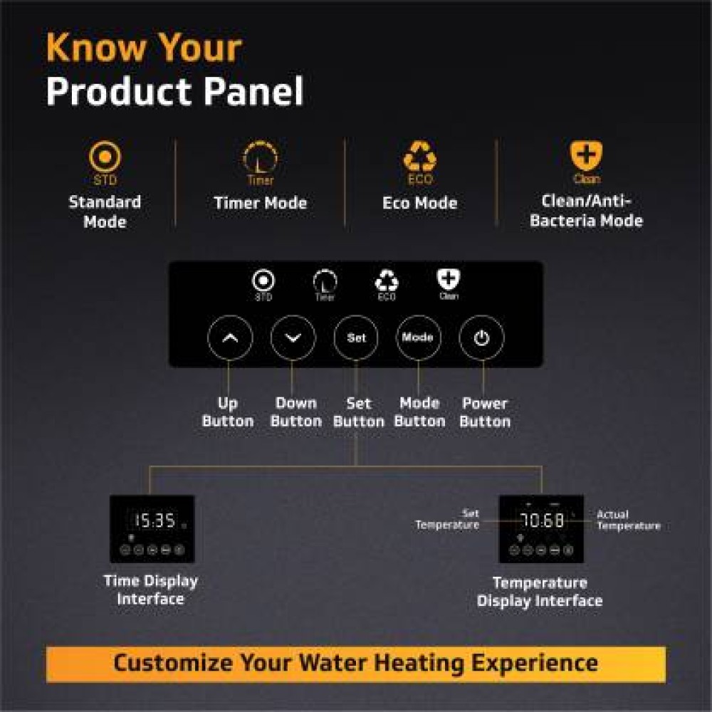 - SMART OPERATING MODES: Customizable water heating experience with 4 different heating modes namely Standard Mode (constant hot water supply at set temperature), Timer Mode (constant hot water supply at set temperature, at the required time), Eco Mode (constant hot water supply at 550C under optimal power consumption) & Anti-Bacterial Mode (sterilize inner tank at 800C, once a month, for a safe and enjoyable bathing experience)