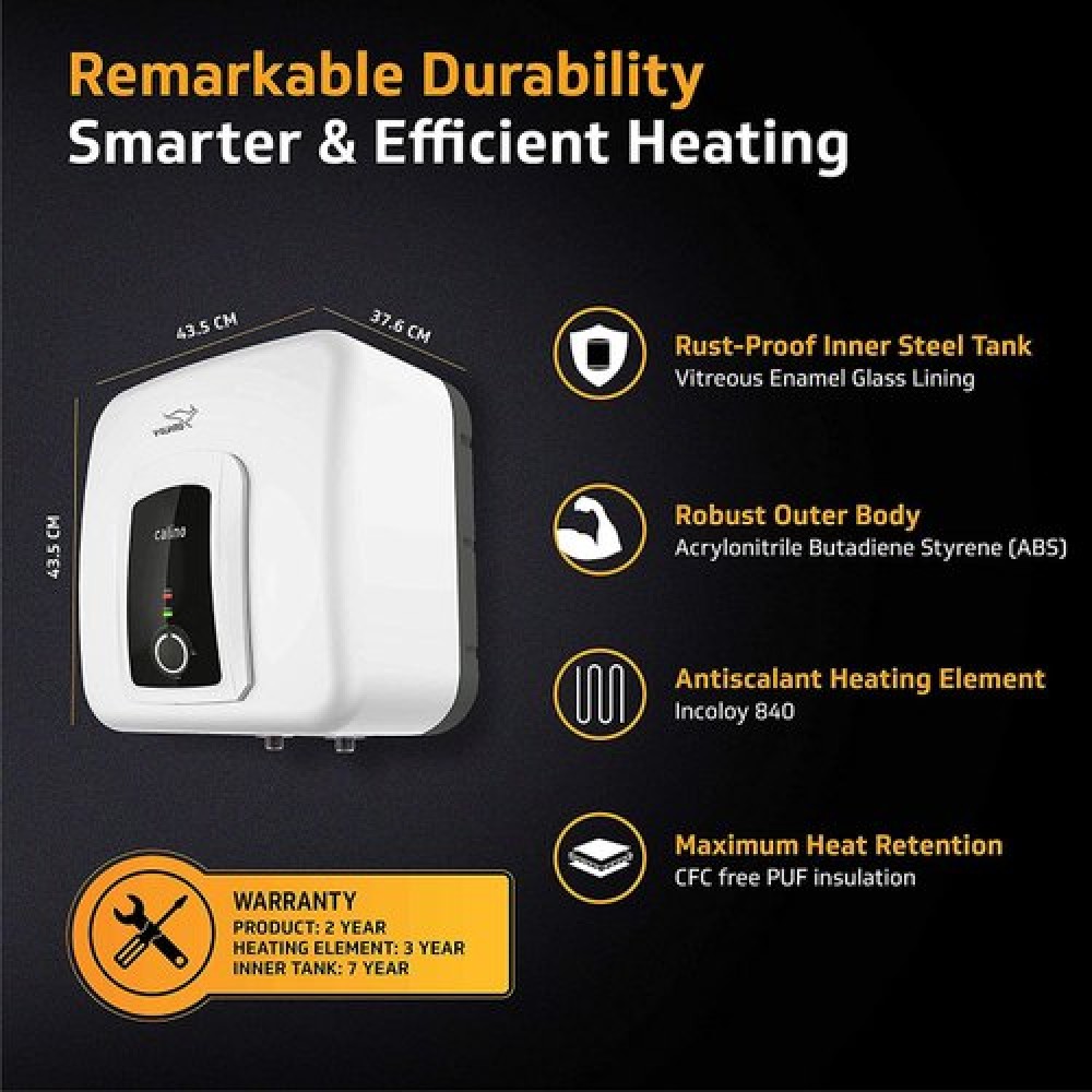 Built with state-of-the-art features such as Vitreous Enamel Coating, Magnesium Sacrificial Anode, Anti-rust Incoloy Heating Element, and Single Weld Line Design, V-Guard’s Calino works well even with hard water and offers increased and prolonged resistance to rust, corrosion, and leakage. This makes the water heater last long and consistently deliver the same superior performance for years.