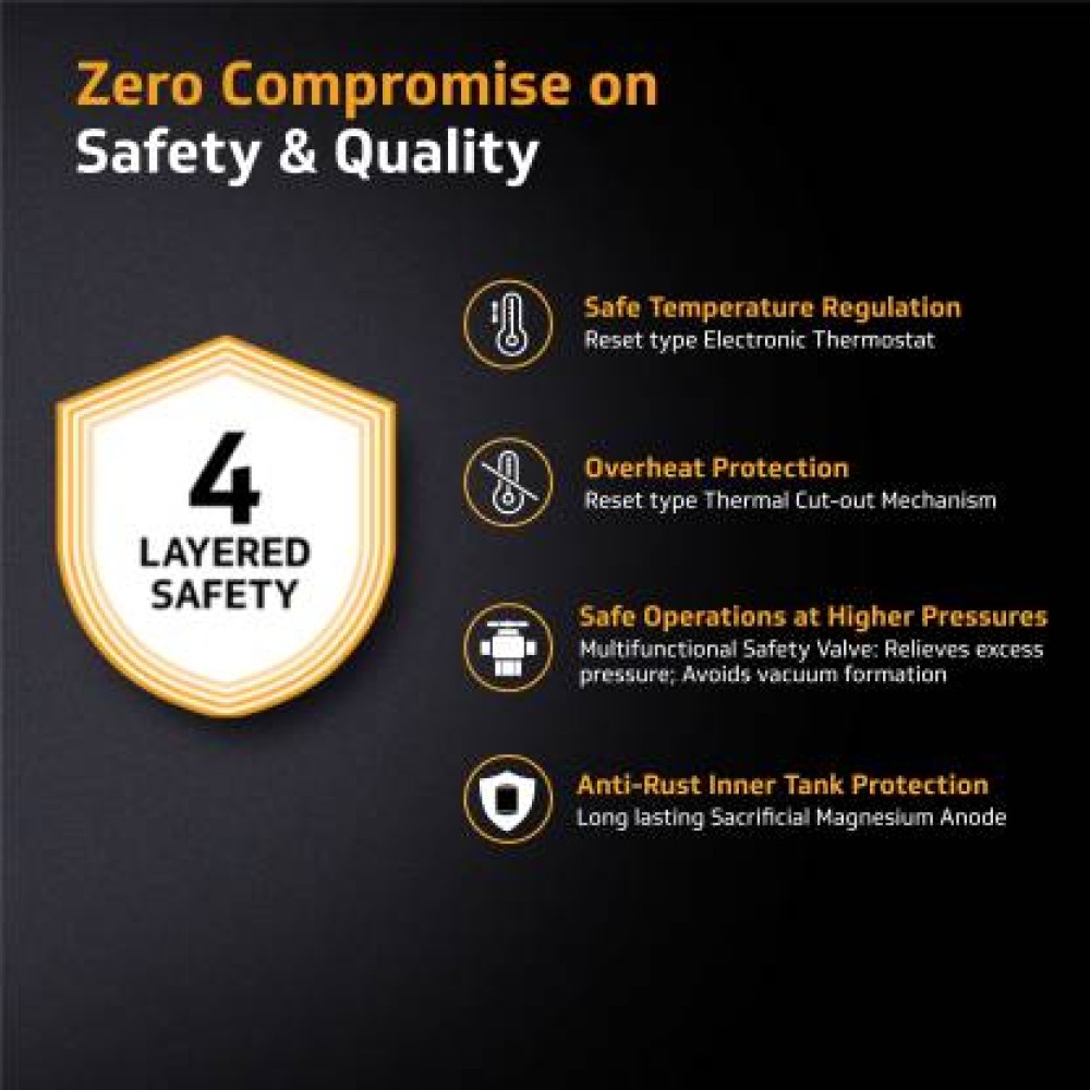 - MULTI-LAYERED SAFETY – Capillary thermostat cuts-off the power supply when temperature exceeds 60 oC, Disc type snap action safety device offers secondary protection from overheating by cutting off the power supply when temperature exceeds 930C. 5-in-1 multifunction valve prevents excessive pressure build-up, vacuum formation and reverse water flow. IPX4 protection safeguards geyser from water spill and splashes.